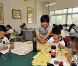 5月27日,一名书法指导老师在河北省廊坊市第十四小学的书法教室内辅导学生们练习书法。河北省廊坊市第十四小学以中国传统文化为根基,融入现代教育理念,在做好常规教育......