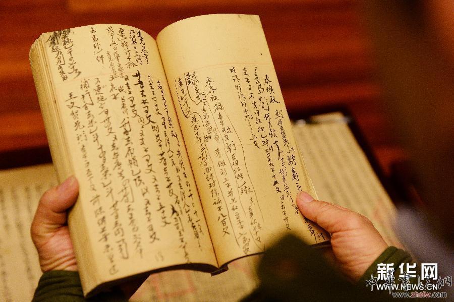 4月28日,上海交通大学曹树基教授在展示一本清朝嘉庆年间的炼铁工业记账本。近日,数千件明清以来的契约及各式文书集中亮相上海交通大学。这些契约、文书由上海交通大学历史系曹树基教授领衔的研究团队历经十年收集整理,展现了浙江南部的松阳县石仓古村落的契约文化和乡土经济。目前,上海交通大学以百年契约文书为主题的研究成果已出版成册——《石仓契约》(第1辑、第2辑),相关成果还将继续出版。(新华社发 赖鑫琳摄)