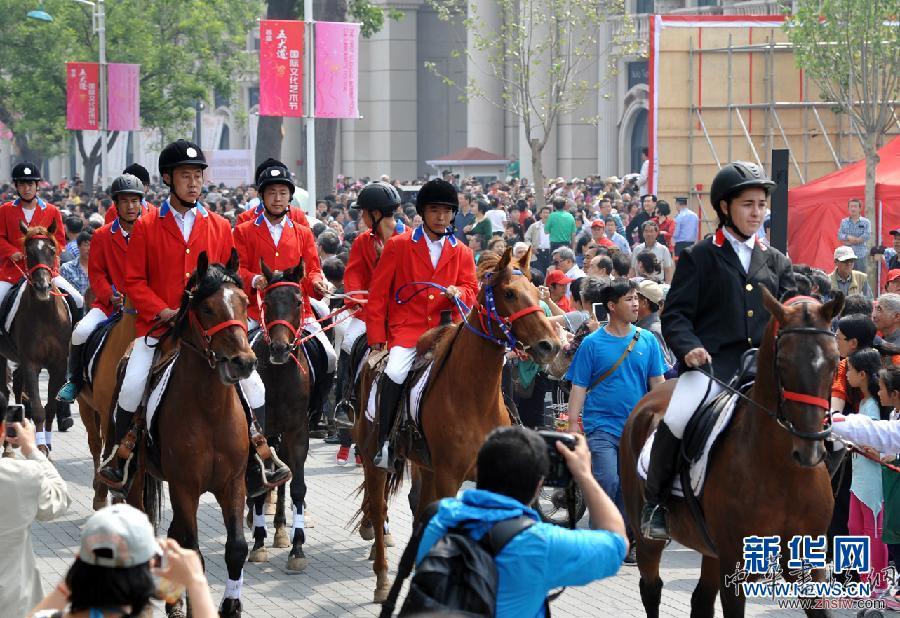 5月1日,在天津市首届五大道国际文化艺术节开幕式上,游客在参观骏马巡游表演。
