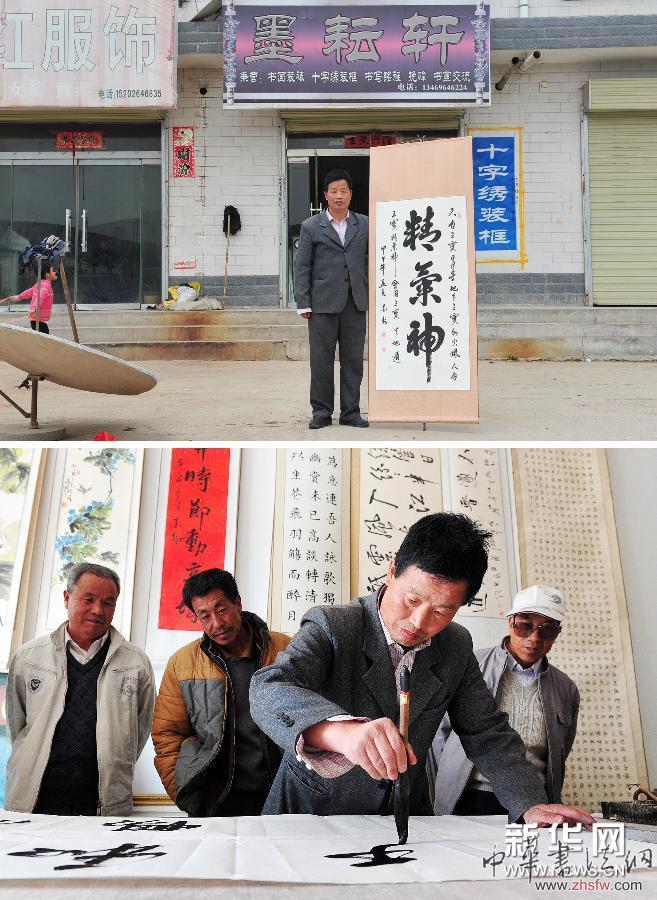 上图:今年50岁的隆德县联财镇联财村农民厚军成在镇上自己开设的名为“墨云轩”的书法作品店外展示自己的作品,几年前,他攒钱开了这家书法作品店,但平时的很多创作都是在村里完成的。下图:厚军成在店内挥毫写字,附近的村民赶来看他写字(5月25日摄)