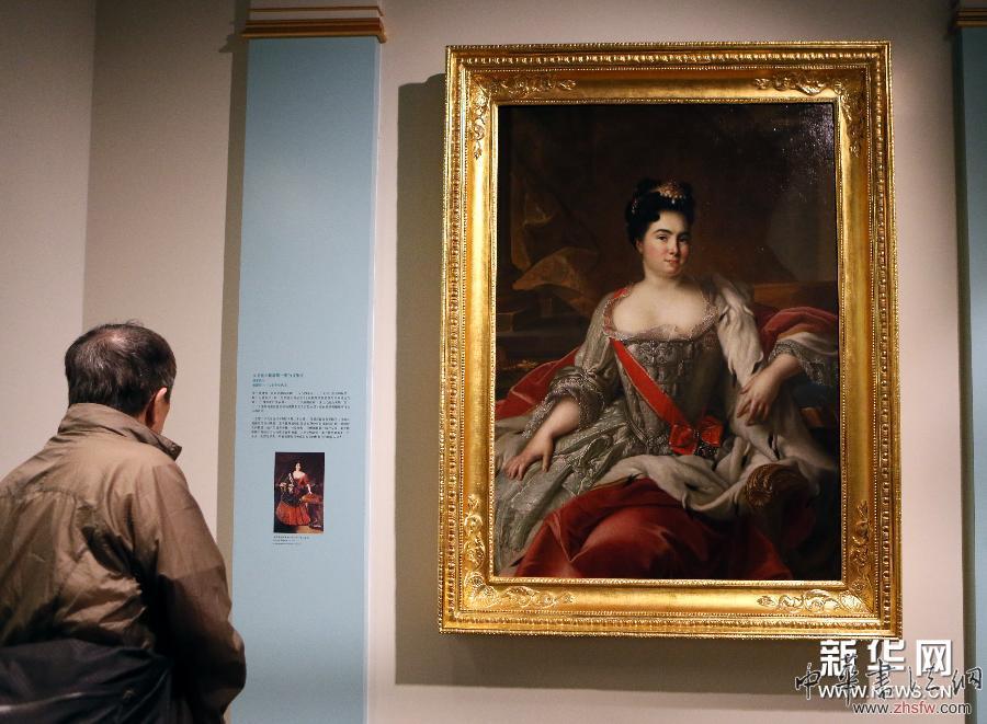 10月28日,观众在“皇村瑰宝:俄罗斯宫廷文物展”上观看展出的女皇叶卡捷琳娜一世的肖像画。
