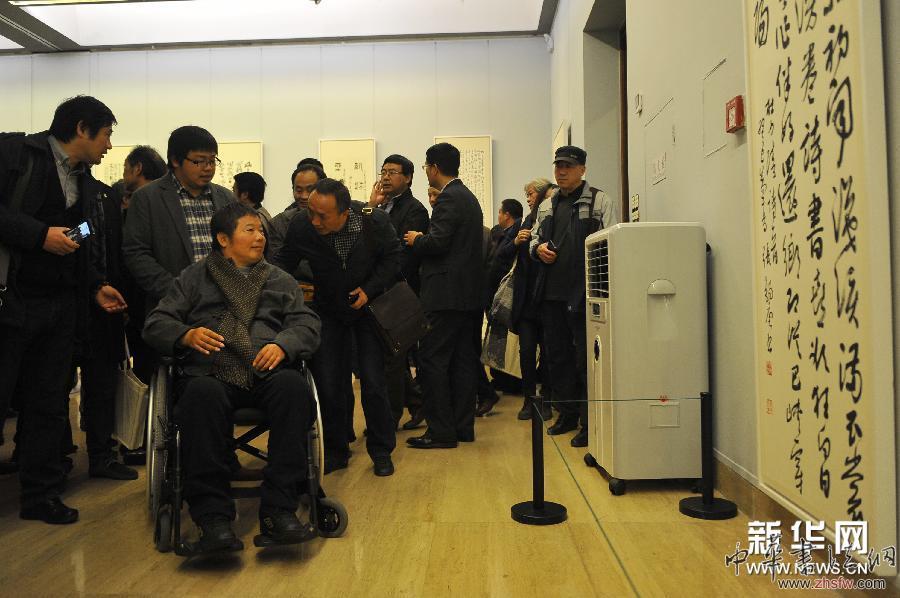 2014年11月19日,“束手有策——张锡庚书法展”在北京中国美术馆开幕。1957年生于江苏江阴的书法家张锡庚,2009年不幸遭遇车祸后高位截瘫,他让家人和学生用布带将毛笔捆绑在手上坚持进行创作。此次来京展出的68幅“束手”书法精品,集中展示了他顽强不息的艺术追求和面貌一新的创作成果。新华社记者 鲁鹏 摄