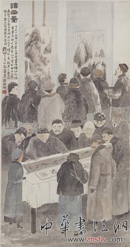 作者描绘的是1917年北京文化艺术界为水灾筹款的展览现场,具有接近新闻照片一样的写实性。画面上社会各阶层人士汇集一堂,气氛热烈。画中人物的面部用笔简洁随意,带有些漫画色彩。作者省略了线条,直接用大块墨色塑造人物的形体,短促细碎的线条只在局部作些勾勒,此外还用接近“飞白”的手法表现物象受光面的明亮部分。这种对线条的省略和对光线的感受及表现与中国传统的绘画技法有着很大的不同,由此可以看出陈师曾的西画造诣。