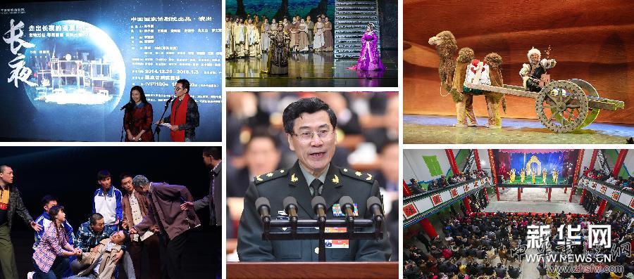 新华网北京3月10日电 “举精神之旗、立精神支柱、建精神家园,都离不开文艺。当高楼大厦在我国大地上遍地林立时,中华民族精神的大厦也应该巍然耸立。”习近平总书记在文艺工作座谈会上的讲话发表以来,广大文艺工作者深受鼓舞,文艺创作欣欣向荣。中下:3月10日,政协委员刘星在全国政协十二届三次会议第三次全体会议上作《作家有信仰 作品有希望文化有力量》的发言(新华社记者王晔摄)。 中上:2014年12月13日,原创歌剧《运之河》在国家大剧院上演(新华社记者罗晓光摄)。左上:2014年12月8日,陶虹(左)和刘威出席由中国国家话剧院出品的农民工题材话剧作品《长夜》新闻发布会(新华社记者高静摄)。左下:2014年12月31日,演员在大型原创京剧《温世仁》中表演(新华社记者陈晔华摄)。右上:1月15日,大型原创民族舞剧《不落的太阳》在呼和浩特上演(新华社记者邵琨摄)。右下:1月22日,村民在江西省都昌县南峰镇少松村文化活动中心欣赏节目《千手观音》(新华社发 傅建斌摄)。