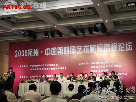 金风送爽,满城桂香的时节,2008杭州?中国第四届艺术财富高峰论坛今天上午在浙江世贸中心隆重开幕。近200位来自海内外企业界、金融界、收藏界代表,海内外艺术品经营企业、画廊、拍卖行代表,著名艺术家代表共聚一堂,就艺术财富领域展开专题研讨。